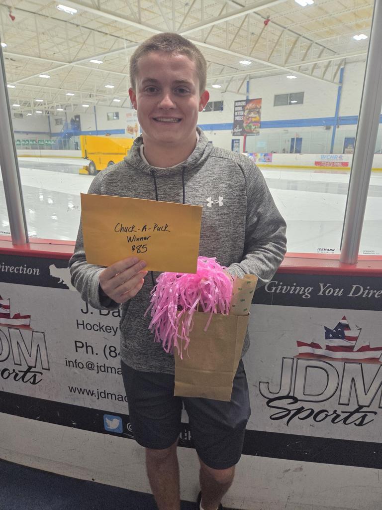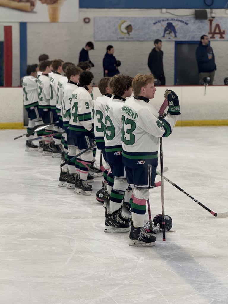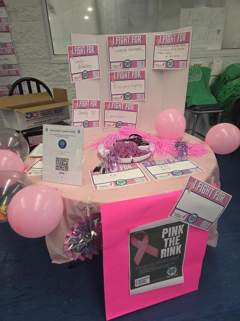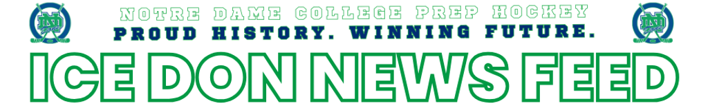 (Oct. 28, 2025) The Notre Dame College Prep Hockey Club dedicated play in the month of October to support the fight against breast cancer. October is breast cancer awareness month and the Dons and their fans helped the cause in different ways. Beyond the customary donning of pink in their traditionally green and blue uniforms, the Dons also hosted a Pink The Rink double header during their Hockey Homecoming games on Saturday, October 18. Roughly $500 was raised throughout various events in the day, including Chuck-a-Puck and fighter sign donations. JV took home a victory against Mt. Carmel Caravan, while varsity lost a hard-fought overtime loss against Deerfield. Heartland Ice Arena was packed with friends of the Dons.